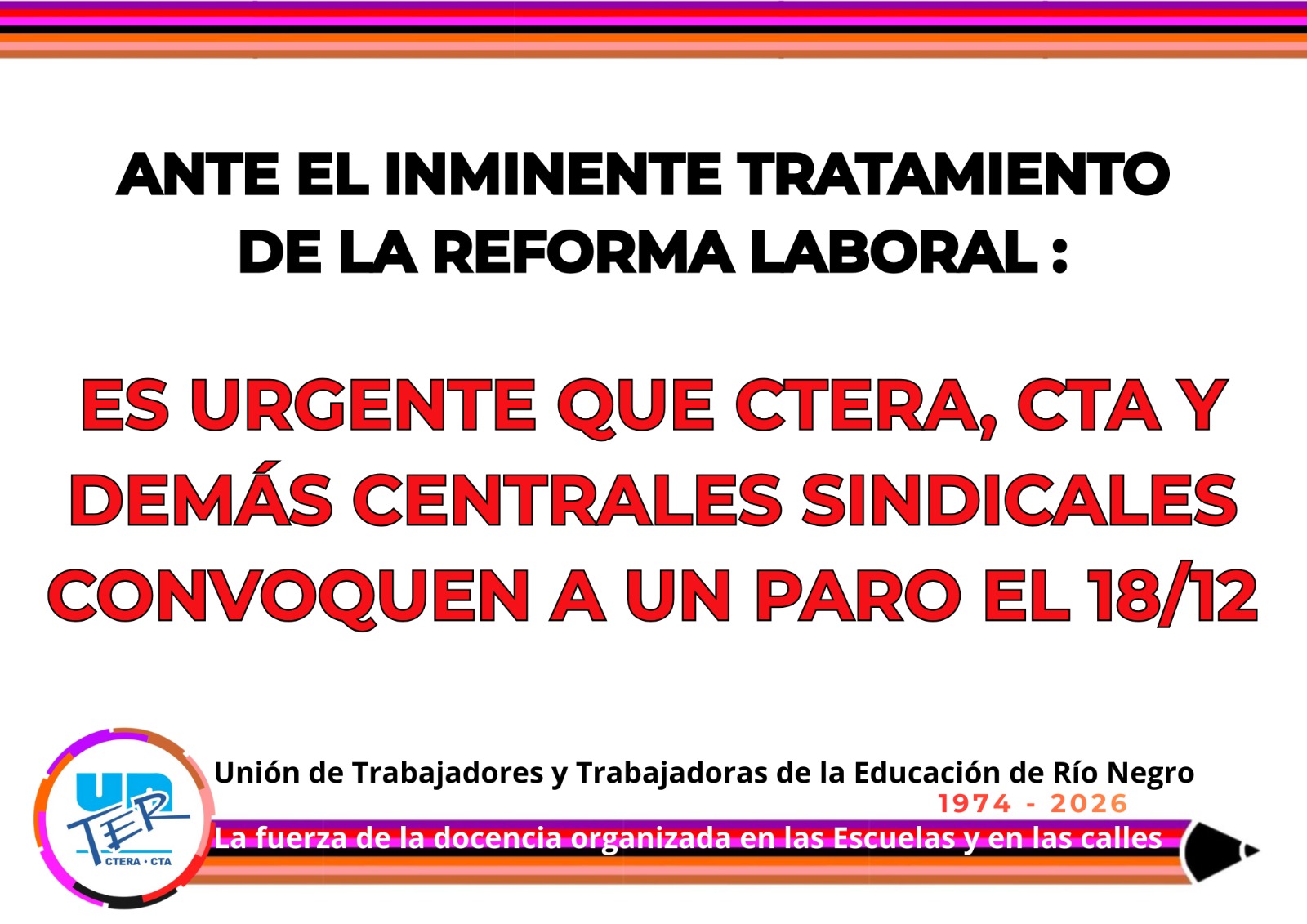El Consejo Directivo Central de UnTER, se presentó el viernes 12 de diciembre, en la Secretaría de Trabajo en Roca – Fiske Menuco, para formalizar el pedido de urgente convocatoria a paritaria. Exigimos al Gobierno Provincial la apertura inmediata de una mesa de discusión que dé respuesta a las demandas centrales de la docencia rionegrina: Recomposición y aumento salarial real, que recupere el poder adquisitivo perdido; Cese inmediato de la auditoría médica privada, un mecanismo de control que vulnera derechos y criminaliza la enfermedad docente; Presupuesto educativo acorde a las necesidades del sistema, garantizando condiciones dignas para enseñar y aprender; Definición de una política educativa democrática, construida con participación de quienes habitamos las escuelas.