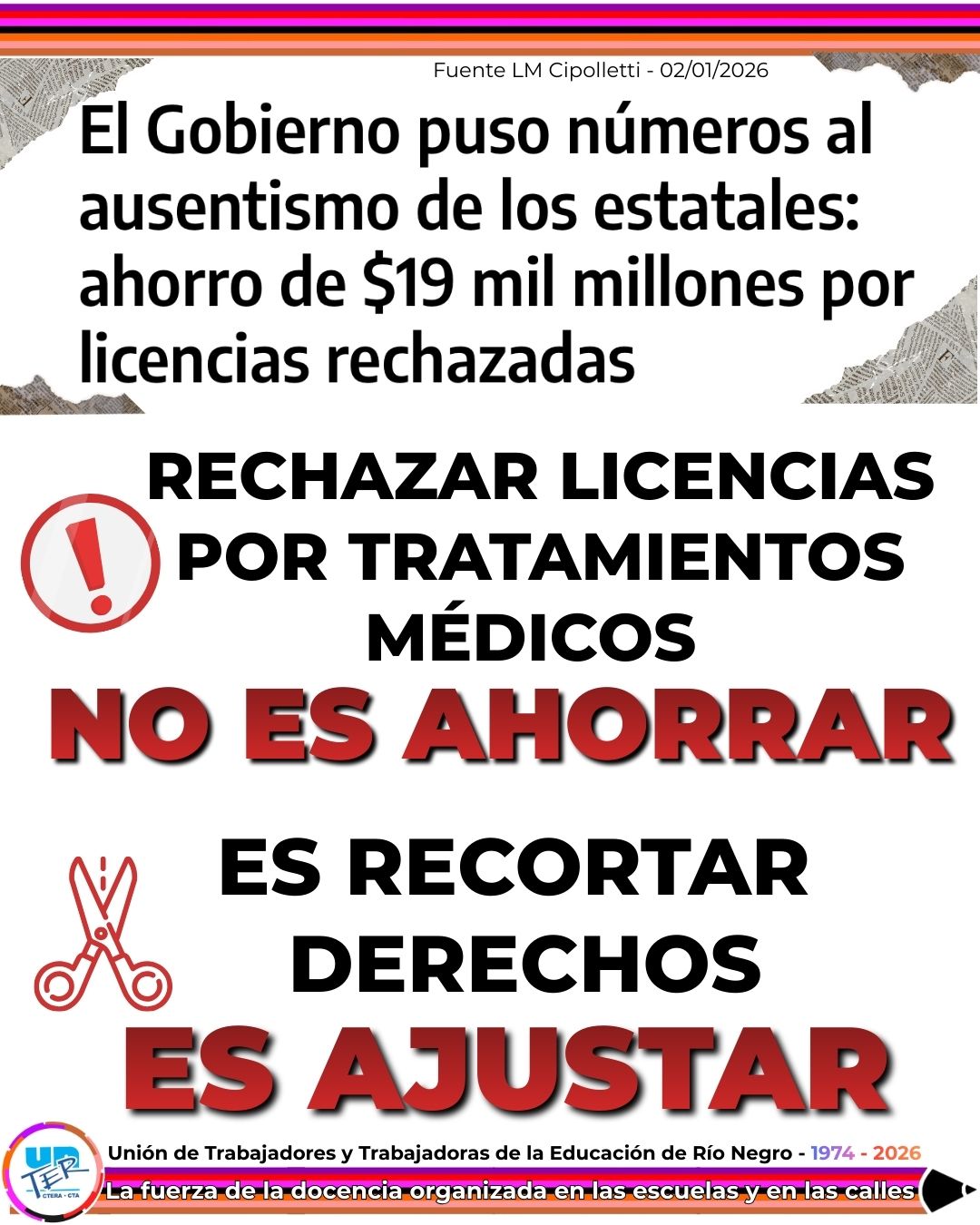 El Gobierno Provincial intenta presentar el rechazo de licencias médicas como una política de ahorro, cuando en realidad se trata de una grave vulneración de derechos laborales y humanos. La Resolución 233/98 garantiza el acceso a licencias por razones de salud sin pérdida salarial ni persecución administrativa. La implementación de auditorías médicas privadas desconoce este marco normativo y reemplaza el cuidado de la salud por una lógica de ajuste y disciplinamiento. Desde Unter exigimos el respeto pleno de la normativa vigente, el fin de las auditorías privadas y políticas de salud que no criminalicen la enfermedad ni el cuidado familiar. Recortar derechos no es ahorrar.