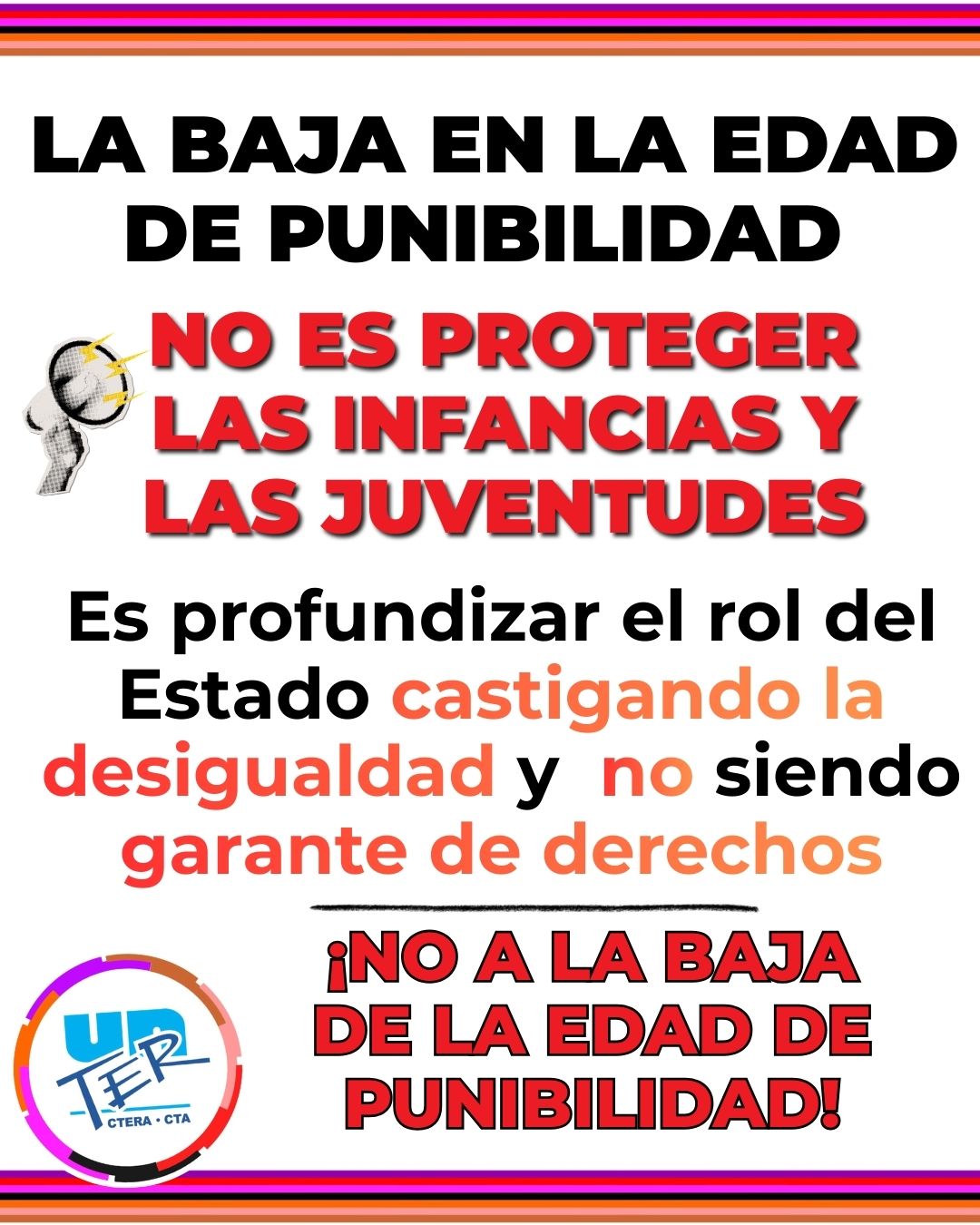 Rechazamo el proyecto, que se debatirá en el Congreso, para bajar la edad de punibilidad de 16 a 14 años y habilitar un régimen penal más severo para adolescentes porque no previene el delito ni aborda sus causas, por el contrario, profundiza la criminalización de la pobreza, estigmatiza a las juventudes de los sectores populares y fortalece un enfoque punitivo que amplía el poder discrecional de las fuerzas de seguridad, en un contexto de retroceso de las políticas sociales, educativas y de contención por parte de los sucesivos gobiernos nacionales y provinciales.