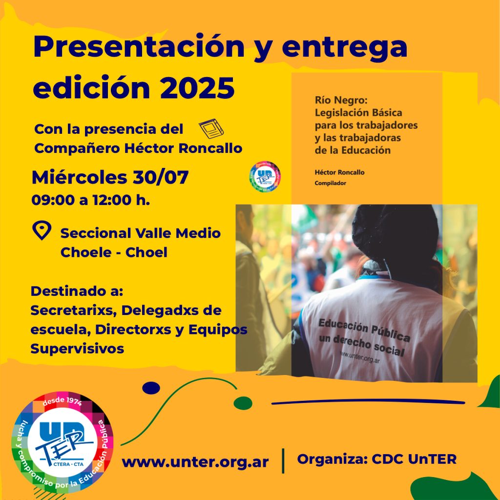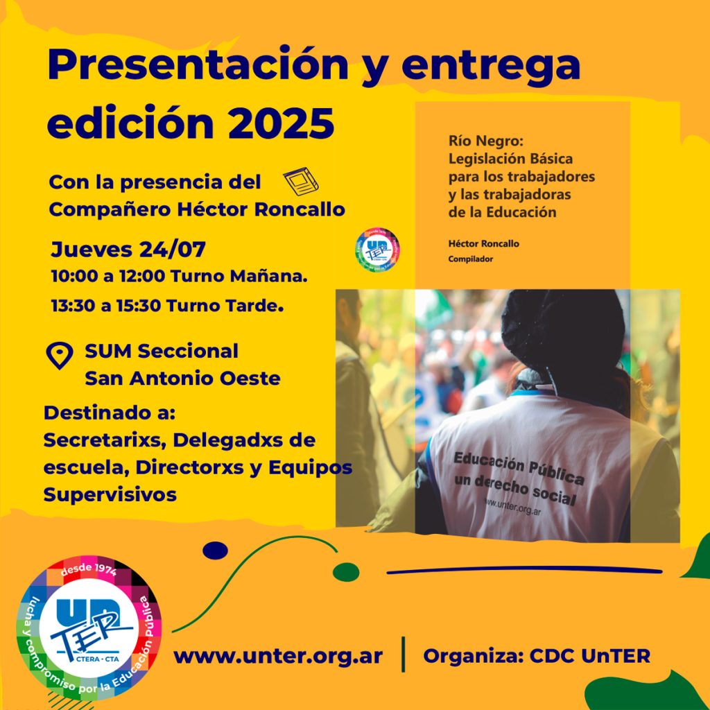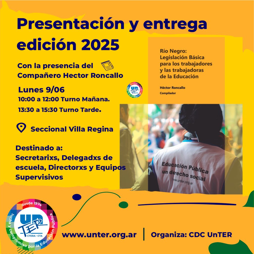 El 27 de mayo se inicia un diagrama de entrega de la edición 2025 del libro «Río Negro: Legislación Básica para los trabajadores y las trabajadoras de la Educación», compilado por el compañero Hector Luis Roncallo, que además de agregar nuevas normativas, contiene las que han sido modificadas, por lo tanto esta publicación complementa la de 2022. También contiene un código QR con acceso a enlaces de contenido de ambas ediciones impresas, el Libro Digital versión 2025 y varios cuadros que ayudan a comprender la multiplicidad de normativas.
