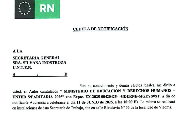 Se recepcionó este jueves 5 de junio la convocatoria a audiencia paritaria con el Ministerio de Educación y Derechos Humanos para el miércoles 11 de junio a las 10:00 hs. en la sede de la Secretaría de Trabajo, en Viedma.