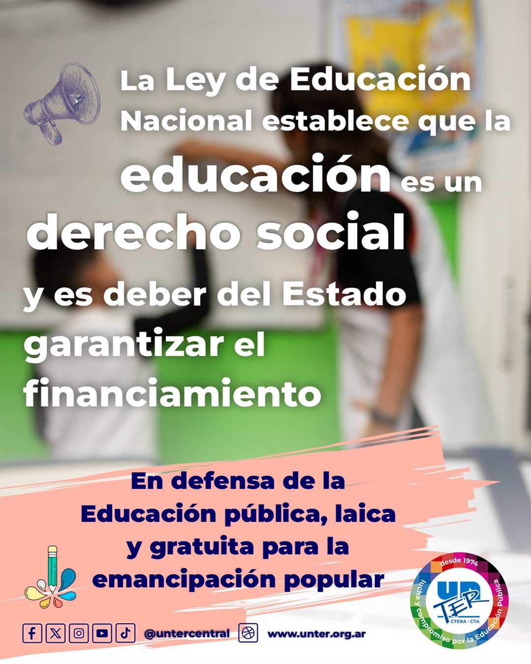 Desde la UnTER defendemos la Ley de Educación Nacional N° 26.206. Una ley que fue construida por el pueblo a través de profundos debates. Una ley que establece que la educación es un “derecho social”. Una ley que determina que es el Estado nacional quien debe garantizar el financiamiento educativo. Una ley del pueblo y para el pueblo.