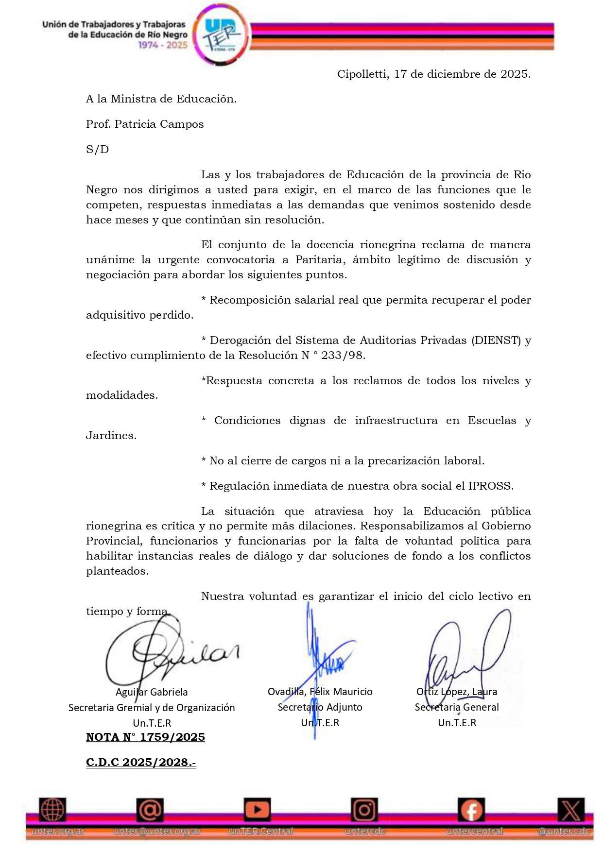 La situación de la Educación Pública rionegrina es crítica y no admite más dilaciones. Responsabilizamos al Gobierno Provincial y a sus funcionarias y funcionarios por la falta de voluntad política para habilitar instancias reales de diálogo y dar soluciones de fondo.