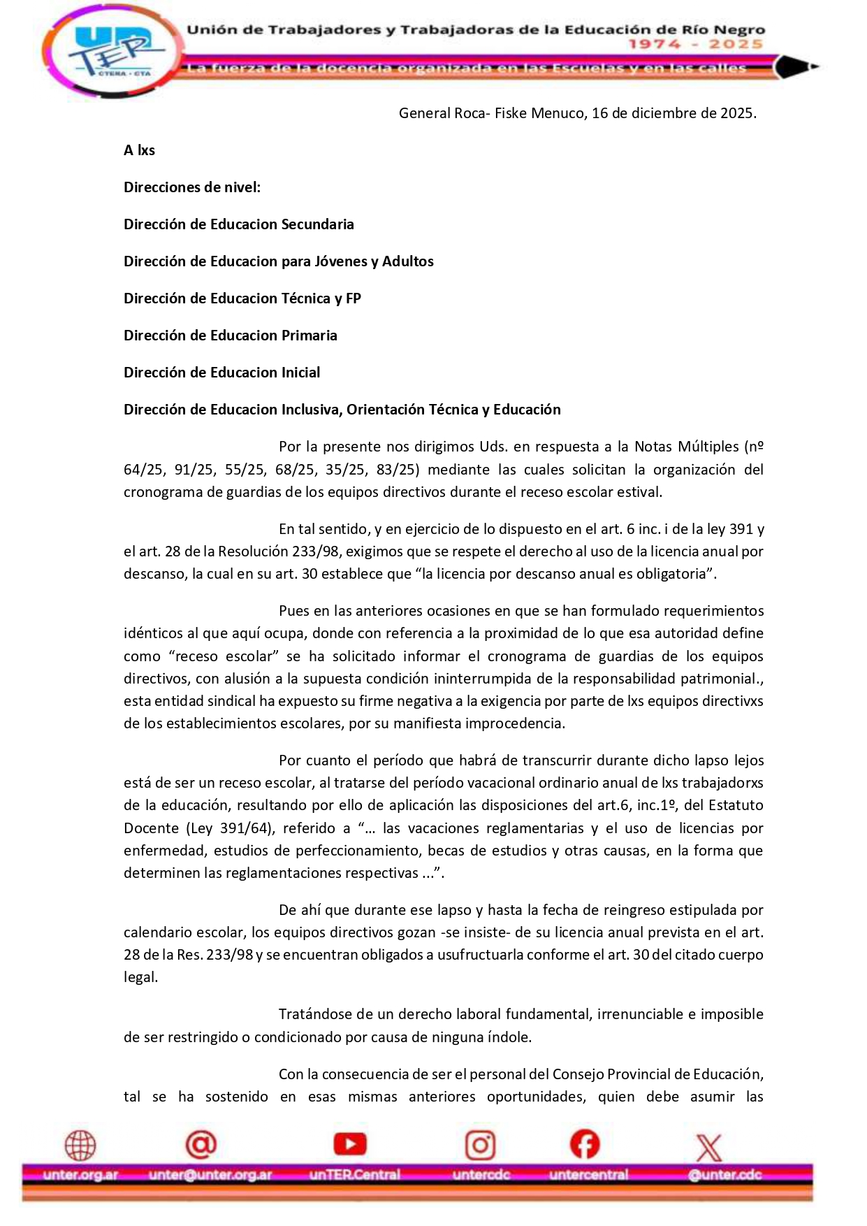 Desde el Consejo Directivo Central de UnTER exigimos que se respete el derecho al descanso anual de los equipos directivos durante el receso de verano.