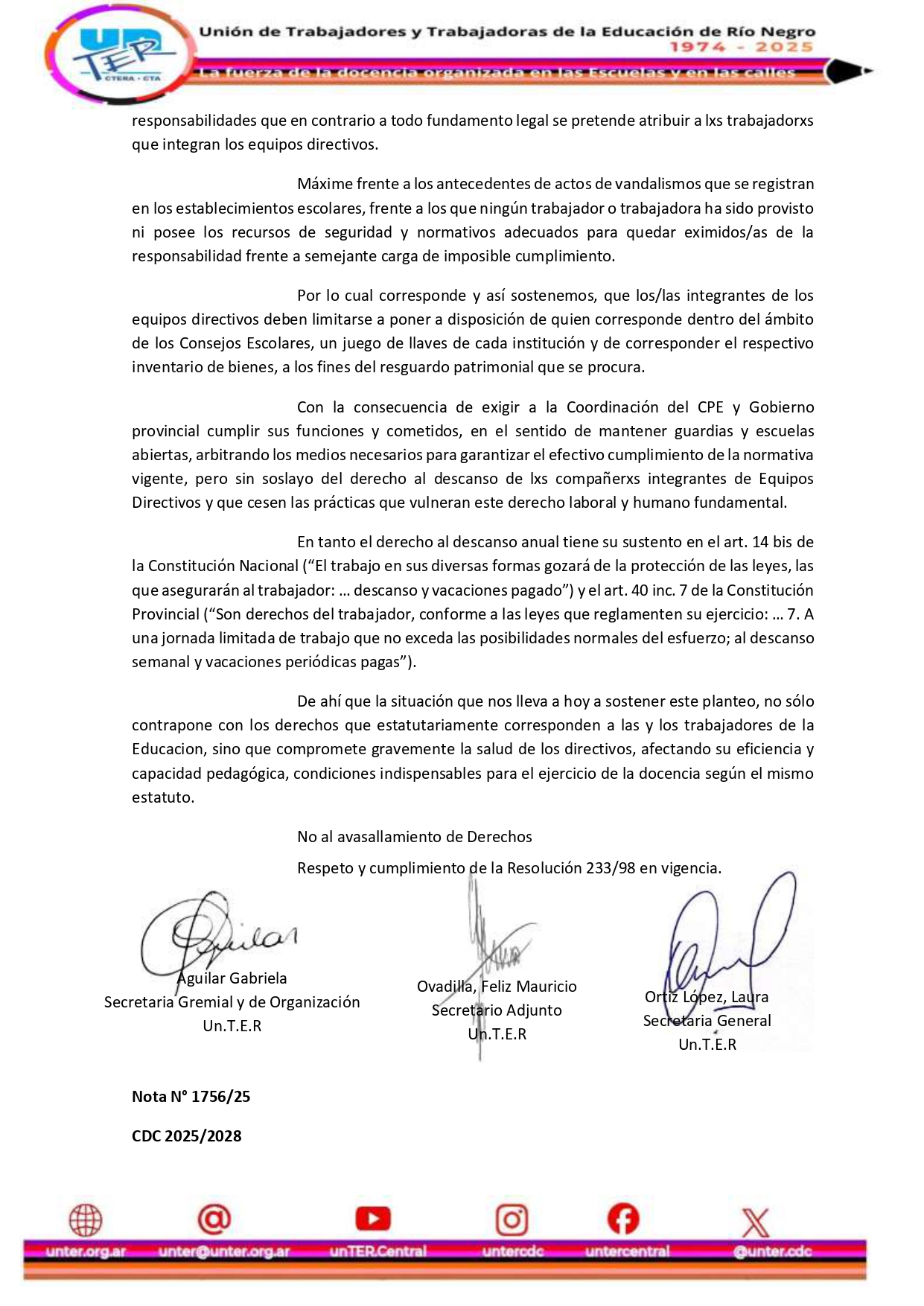 Respaldamos nuestro reclamo en el Estatuto Docente (Ley 391), la Resolución 233/98 y las Constituciones Nacional y Provincial. El resguardo patrimonial de las escuelas no puede recaer sobre las trabajadoras y los trabajadores, y menos aún sin recursos ni condiciones de seguridad.