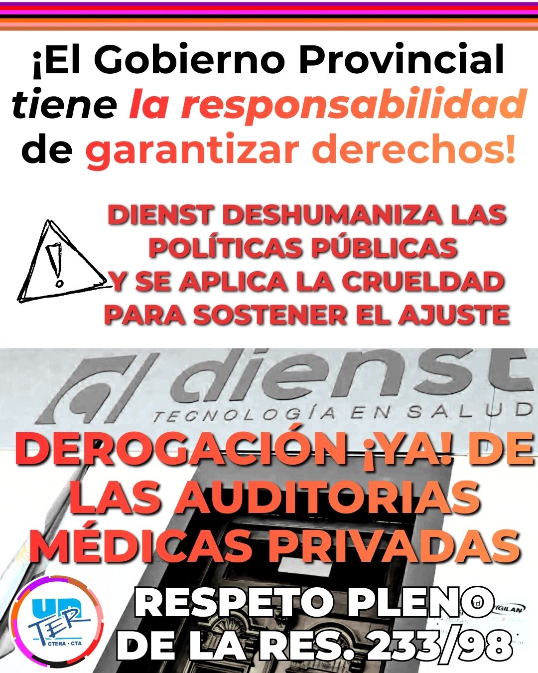 La implementación del sistema de auditorías médicas privadas (DIENST) desconoce ese derecho, reemplazando criterios médicos y normativos por una lógica de ajuste, deshumanización y recorte del gasto público a costa de la salud de las y los trabajadores.