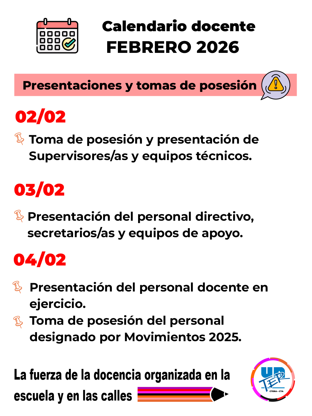 Las/os compañeras/os Vocales Gremiales en las Juntas de Clasificación comparten información y fechas del calendario docente, en febrero de 2026: Presentaciones y tomas de posesión; Vacantes y asambleas; Inicio del ciclo lectivo periodo Periodo RIE.