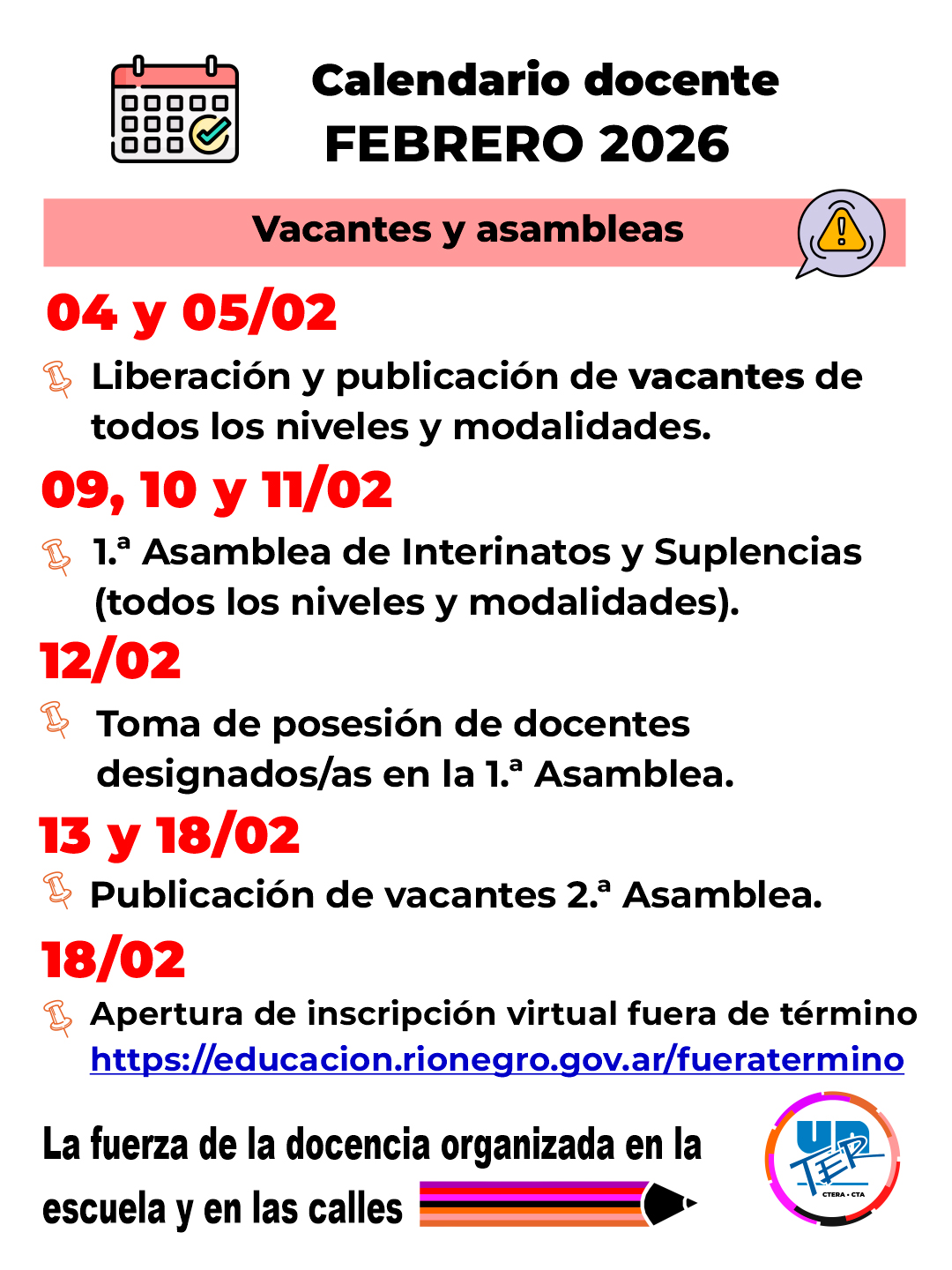 • 18/02: Apertura de inscripción virtual fuera de término https://educacion.rionegro.gov.ar/fueratermino