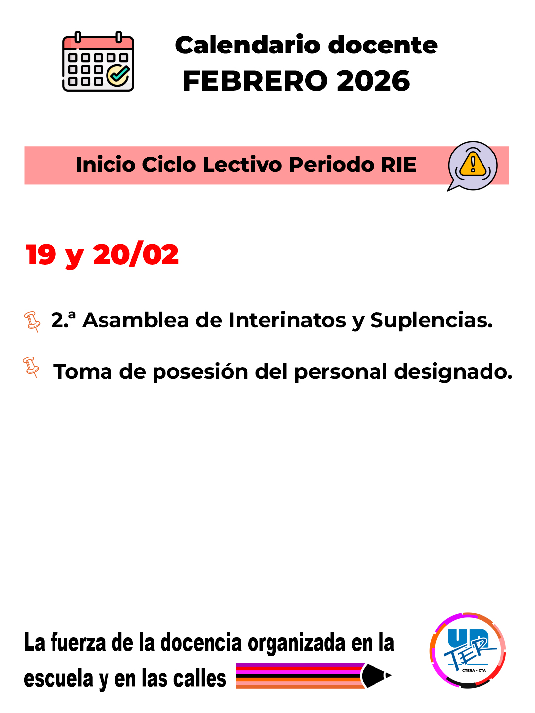 • 19 y 20/02: 2.ª Asamblea de Interinatos y Suplencias. Toma de posesión del personal designado.