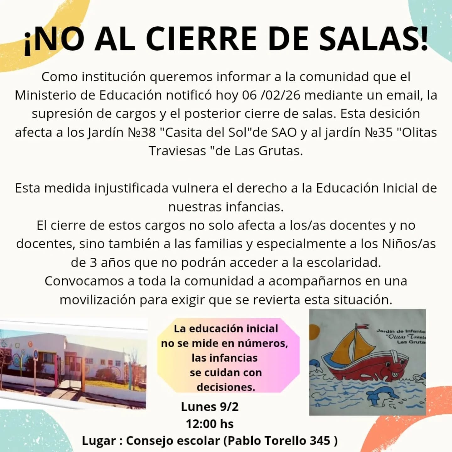 Estas medidas implican precarización laboral, pérdida de puestos de trabajo y un vaciamiento progresivo de la educación pública, desconociendo el rol fundamental del Nivel Inicial en el desarrollo integral y social de las infancias.