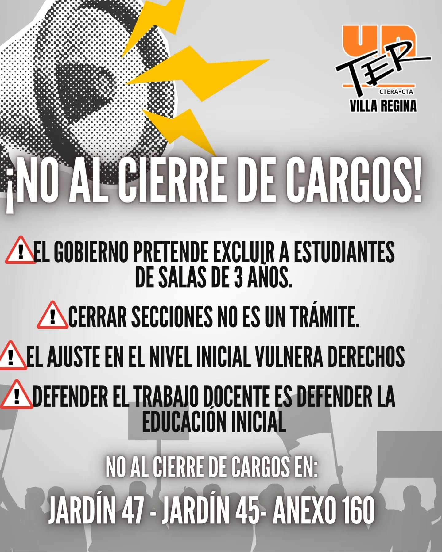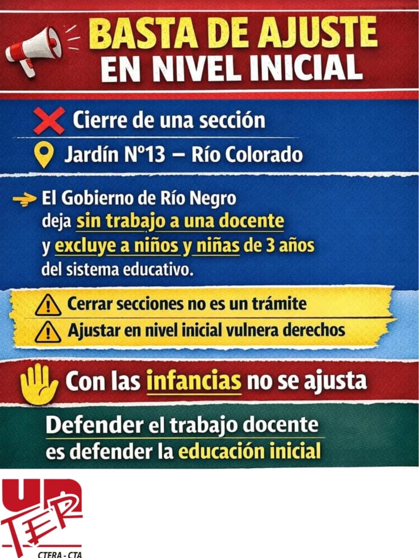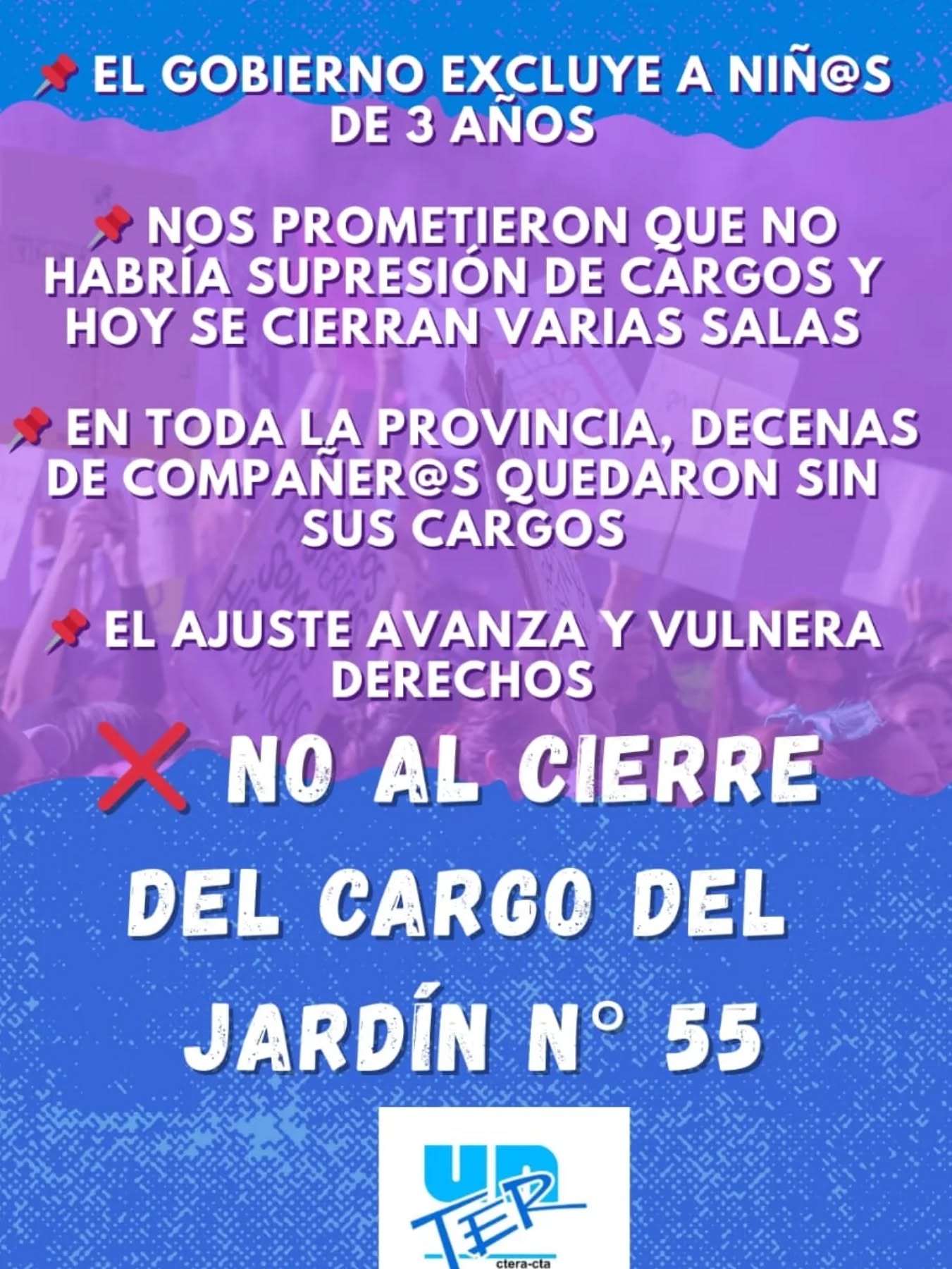 Desde UnTER exigimos al Gobierno provincial el cese inmediato de los cierres de salas y cargos, la preservación de todas las fuentes laborales y la apertura de instancias de diálogo real que permitan abordar la situación desde una perspectiva pedagógica y no meramente administrativa.