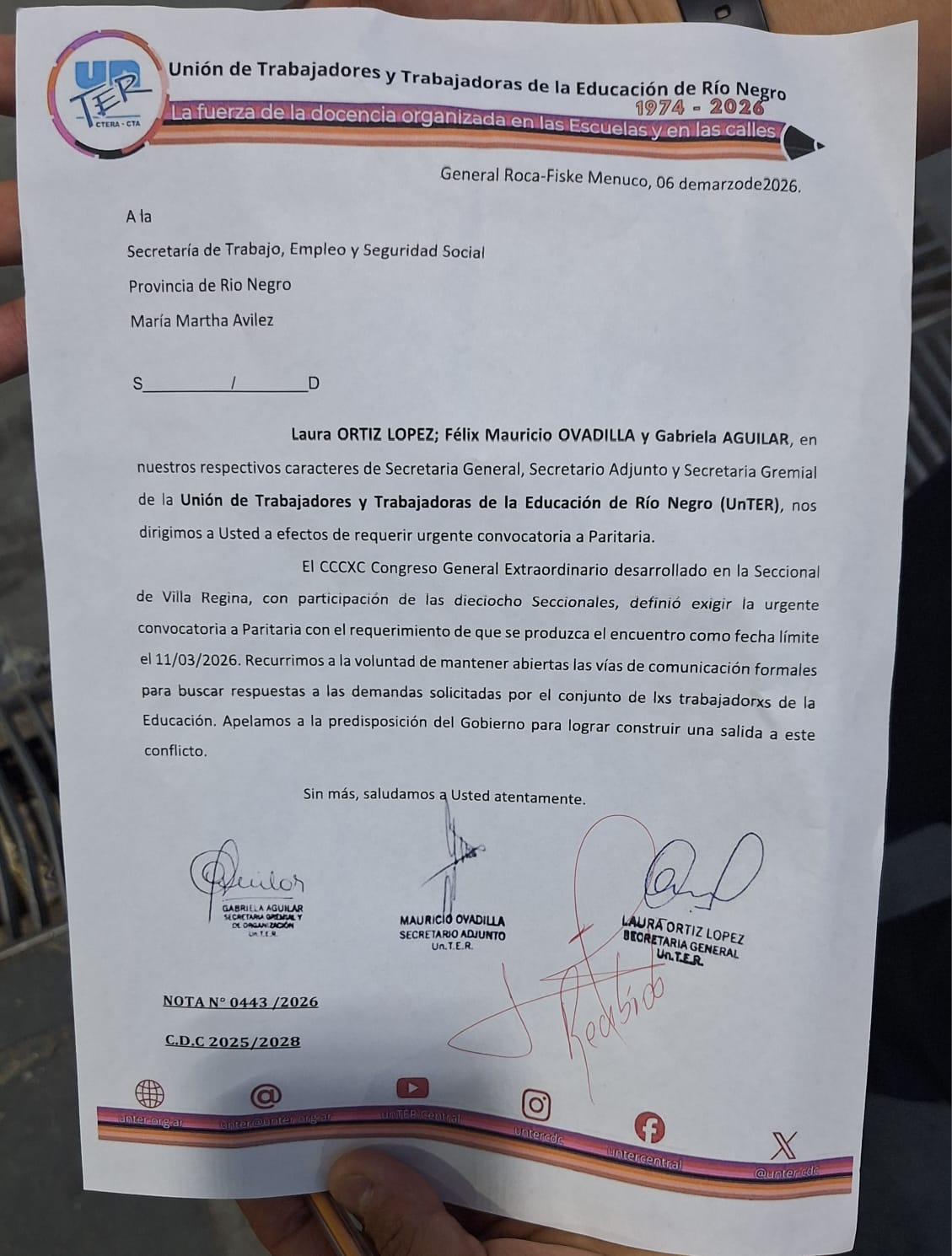 En el marco de la Corrida de Cipolletti, desde UNTER hicimos entrega al Gobernador Alberto Weretinelck de la nota de llamado urgente a paritaria.